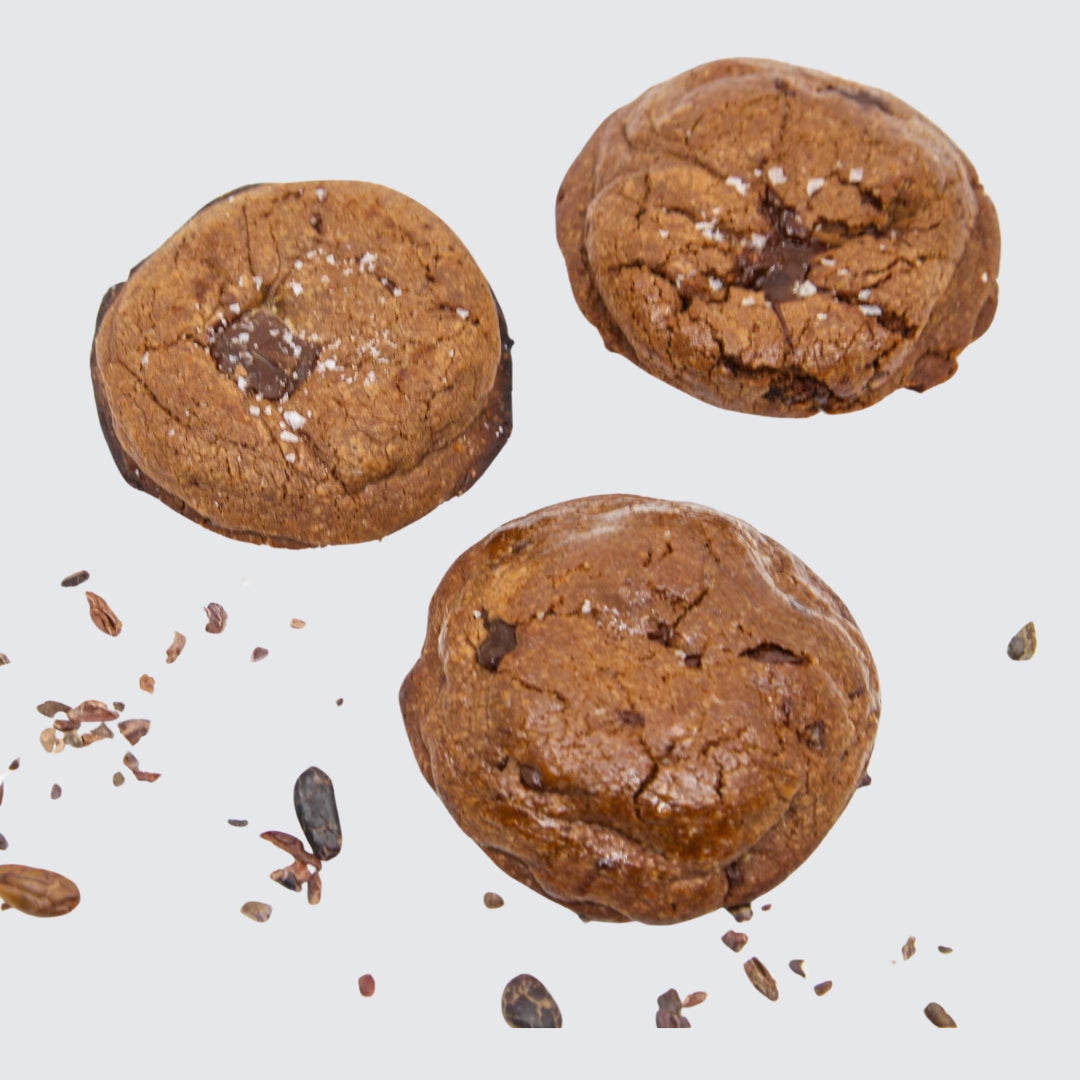 Ingredients: Flour, Unsalted Butter, Semi-sweet chocolate, Vanilla Extract, White Sugar, Light Brown Sugar, Egg, Cacao Powder, Baking Powder, Baking Soda, Salt, Maldon Salt